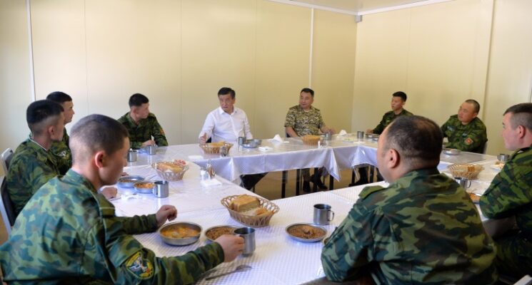 Мамлекет башчысы аскердик бөлүктүн аймагын көрүп чыгып, аскер кызматкерлери менен бирге тамактанды.