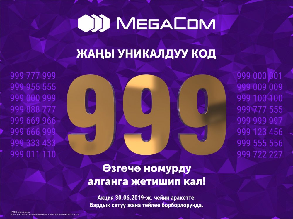 Эгерде өзүңүз каалаган кооз номурга ээ болгуңуз келсе, шашылыңыз! Жаңы коду менен номурлар MegaCom компаниясынын бардык Сатуу жана тейлөө борборлорунда! Аракеттеги акциянын алкагында, MegaCom #СУПЕРЫҢГАЙЛУУ тарифин кошуп алууда, 999 уникалдуу коду менен «Күмүш» категориясынын номуру белекке берилет. Акция 30.06.2019-ж. чейин аракетте.