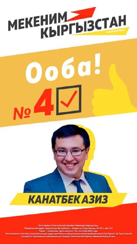 Буюртма каржы маселелери боюнча ыйгарым укуктуу өкүл Джайчиева Гулбарчин Эр Турсуновна тарабынан «Мекеним Кыргызстан» партиясынын атайын шайлоо фондунун эсебинен каржыланды. Юридикалык дареги: Кыргыз Республикасы, Бишкек шаары. Турусбеков көчөсү, 109/1. 510-кабинет.
