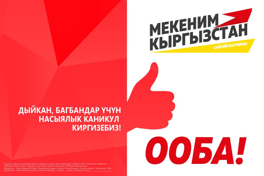 Буюртма каржы маселелери боюнча ыйгарым укуктуу өкүл Джайчиева Гулбарчин Эр Турсуновна тарабынан «Мекеним Кыргызстан» партиясынын атайын шайлоо фондунун эсебинен каржыланды. Юридикалык дареги: Кыргыз Республикасы, Бишкек шаары. Турусбеков көчөсү, 109/1. 510-кабинет.