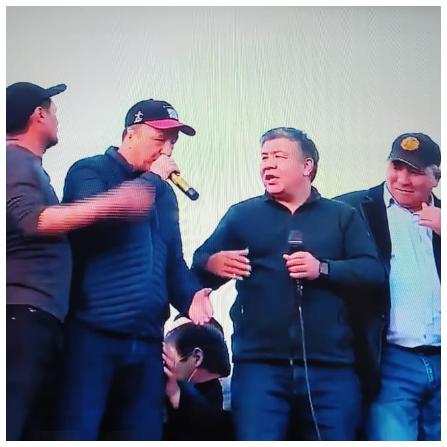 Ал өз сөзүндө: --Адамдардын көпчүлүгү кызуу кандуу. Учурда бул топко келип катышууда. Митингде башында турган лидерлер азырынча жок. Азыр эле ЖК депутаты Алмамбет Шыкмамбетов, Курсан Асанов менен Мелис Турганбаев келди. Эмнегедир Мелис Турганбаев эл менен сүйлөшүү учурунда кызуу көрүндү. Аз убакыт өтпөй эле аны трибунадан түртүп салышты, - деди кабарчыбыз жеринен.