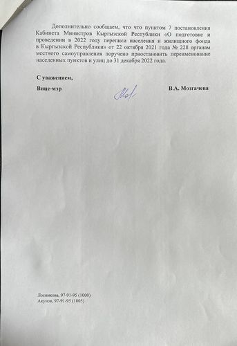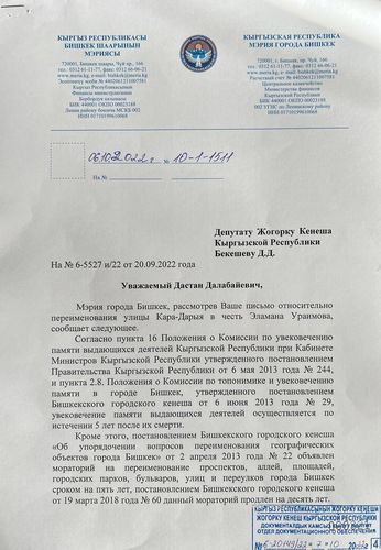 Дастан Бекешев вице-мэр Виктория Мозгачева кол койгон муниципалитеттин расмий жообун жарыялады. Анда көчөлөрдүн атын өзгөртүүгө мораторий киргизилгени жана көрүнүктүү инсандын элесин түбөлүккө калтыруу алар өлгөндөн беш жыл өткөндөн кийин ишке ашырылаары айтылат.