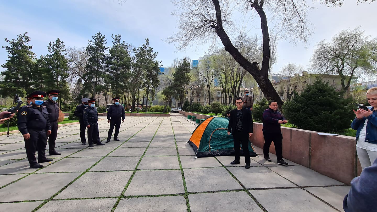“Чатырыбызды мыйзамсыз биздин каршылыгыбызга карабай алып коюшту. Акциябыз үч күн болот. Бизди угушпайт экен, ошондуктан, ушундай жолдорго барууга аргасызбыз”, – деди “Кыргызстан коммунисттери” партиясынын өкүлү Амантур Манапбев.