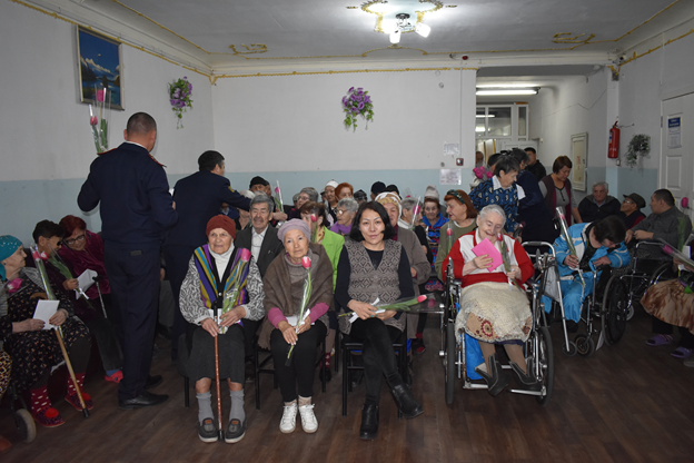 Бүгүн, 8-мартта Бишкек ш.ИИББгы боюнча Милициянын кайгуул кызмат башкармалыгынын кызматкерлери Бишкек шаардык улгайган жана ден-соолугунун мүмкүнчүлүгү чектелген жарандар үчүн жалпы типтеги социалдык стационардык мекемеге барып, 8- март Айымдардын эл аралык күнү менен куттуктап ,майрамдык маанай тартуулашты.