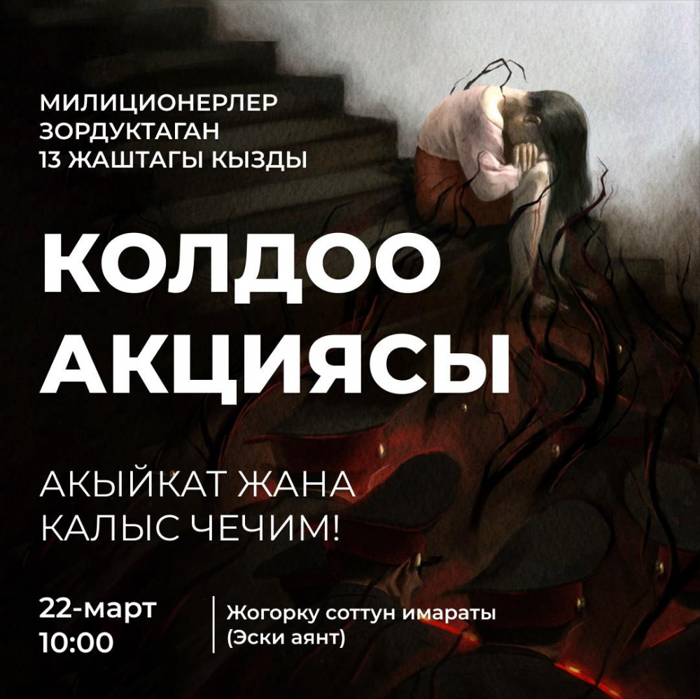 22-мартта саат 10:00дө Эски аянттагы Жогорку Соттун имаратынын алдында 13 жашында зордукталган кыздын жакындары митингге чыгышат.