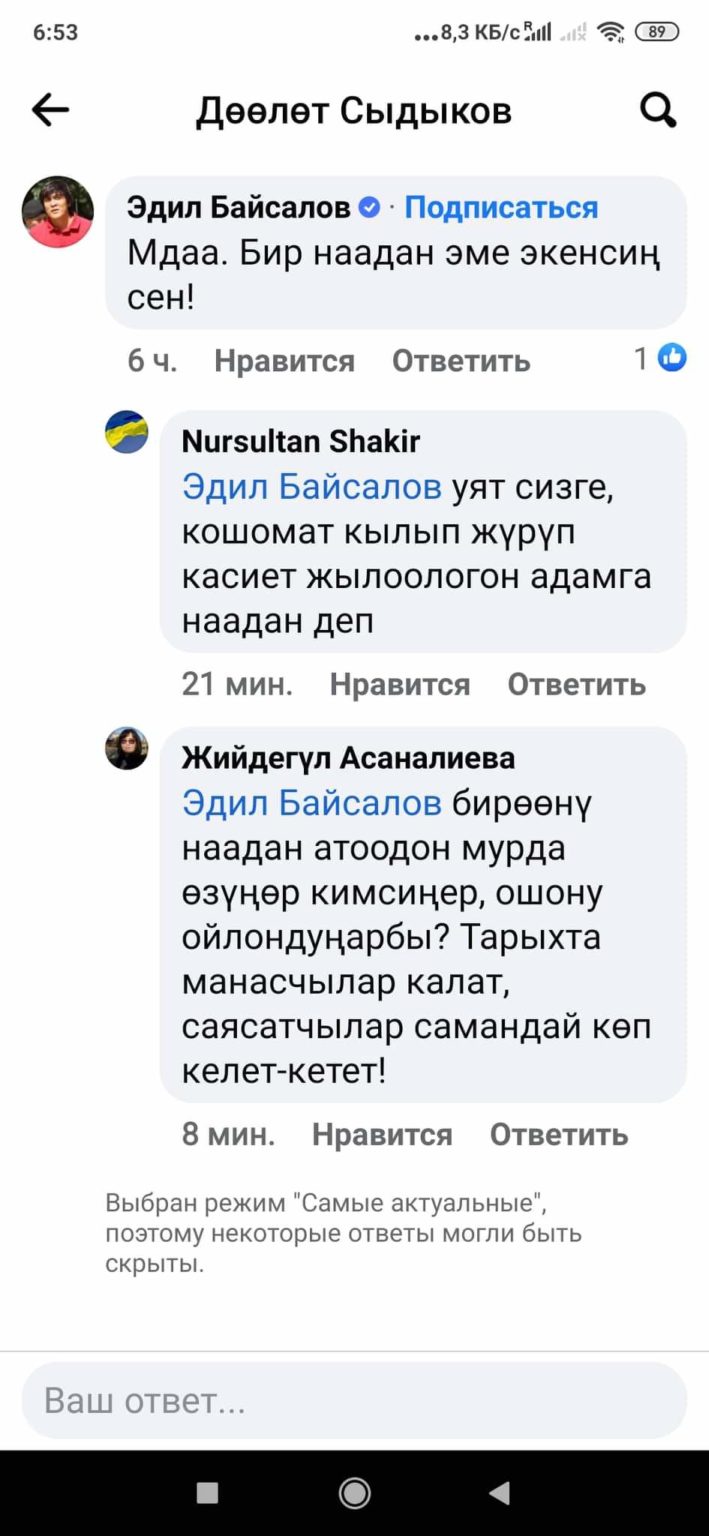 Беделдүү аткаминердин бул сөздү айтканы жарашпас, эми Эдил Байсалов кантип акталар экен?