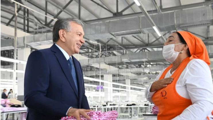 Өзбекстандын президенти Шавкат Мирзиёев Анжиян облусуна жасаган сапары учурунда жаңы ачылган трикотаж-кийим тигүү ишканасына барды.