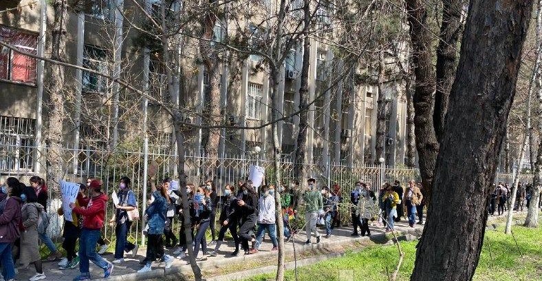 Ички иштер министрлигинин алдына митингге чогулган тараптар өкмөт үйүн көздөй бара жатышат. Чогулгандар ИИМ, өкмөт, президенттен дагы бул иш боюнча жооп беришин талап кылышууда. Митингге миңге чукул адам катышууда.