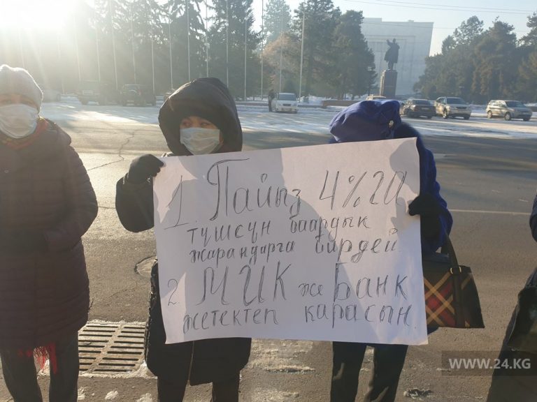 Мамлекеттик ипотекалык компаниядан насыя алган 15 чакты адам бүгүн, 23-декабрда Өкмөт үйүнүн алдына пикетке чыкты. Алар өзүлөрүн Бишкектен, Канттан жана Сокулуктан келген мугалимдер жана дарыгерлер деп тааныштырып, мамлекеттен ипотеканын негизинде батир алганын, бирок үстөк пайызын төлөөдө кыйналып жатканын айтып беришти.