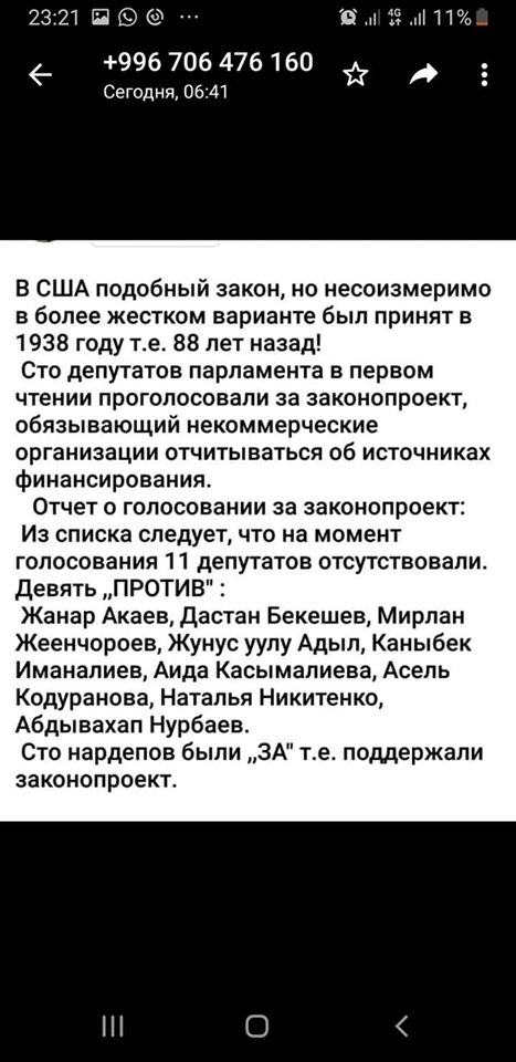 Жакында күн тартибине киргизилип, ЖКте каралган "Бейөкмөттөр (НПОлор) жөнүндө" - мыйзамдын биринчи окууда каралган тартипте каршы добуш берген төмөнкү 9 депутатка, катышып туруп, добуш бербей койгон, калыстыкты көрсөткөн 11 депутатка "Кыргыздын чет өлкөлүк агенттери "-деген, макамды кошо берип, ишенбөөчүлүк көрсөтүүгө чакырамын. Алар батыштын тарбиясына сугарылган депутаттар болуп эсептелет.