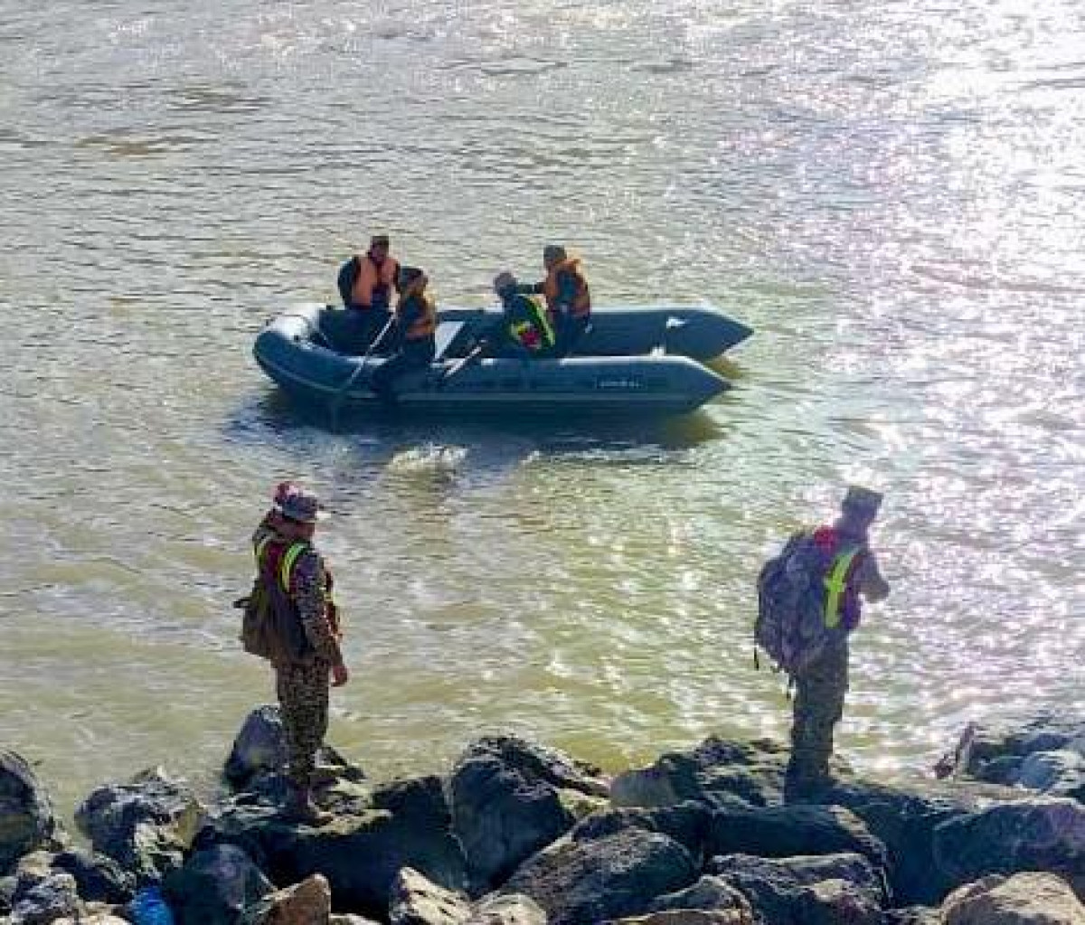 Бүгүн, 9-апрелде Аксы райондук №30 өрт-куткаруу бөлүгүнөн 12 куткаруучу 1 кайык, КР ӨКМдин Республикалык өзүнчө куткаруу отрядынан 5 куткаруучу (суучулдар) 1 кайык, КР ИИМден 3 кызматкер, Чек ара кызматынан 10 адам, жергиликтүү тургундардан 10 адам, жалпы 40 адам, 2 кайык тартылды.