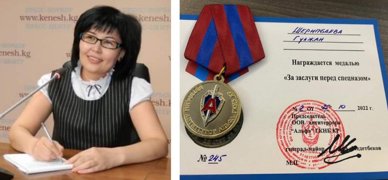 Бүгүн NazarNews маалымат агенттигинин башкы редактору Гүлжан Шерипбаевага "Атайын аскерлерге кызмат кылгандыгы үчүн" төш белгиси тапшырылды. Төш белгини КР МУККнын «Альфа» антитеррордук бөлүмүнүн төрагасы, генерал-майор Артур Медетбеков тапшырды.