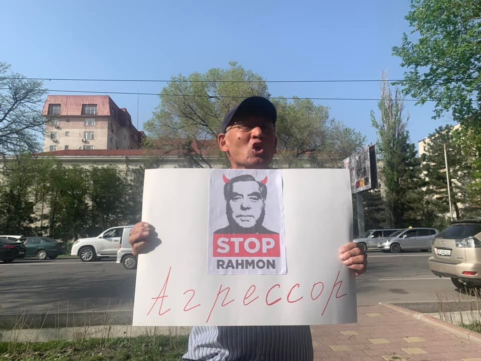 Жарандык активист Өндүрүш Токтонасыров Кыргызстан менен Тажикстандын чек арасындагы акыркы чырга байланыштуу тажик бийлигин сындап бүгүн, 13-апрелде Бириккен Улуттар Уюмунун Бишкектеги (БУУ) кеңсесинин алдына пикетке чыкты.