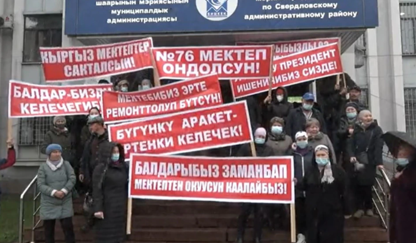 Чогулгандар “Балдарыбыздын заманбап мектепте окуусун каалайбыз!”, “Кыргыз мектептер сакталсын!”, “№76 мектеп оңдолсун!” деген жазууларды көтөрүп турушту.