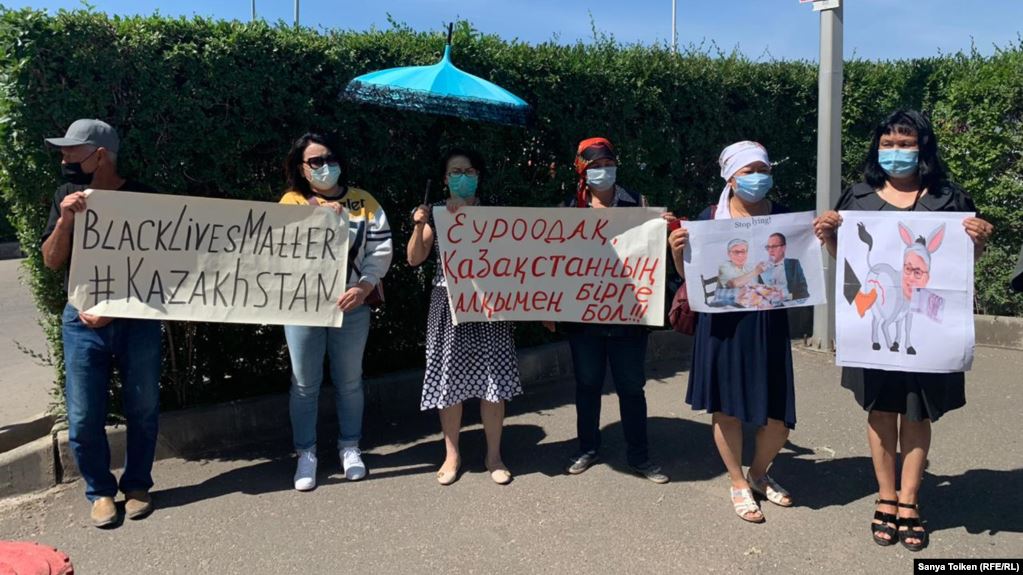 10-июнда Европа биримдигинин (ЕБ) Нур-Султан шаарындагы өкүлчүлүгүнүн алдына чогулган он чакты киши өткөн жумада кармалган үч активистти бошотууну талап кылышты. Бул тууралуу казак басылмалары жазып чыкты.