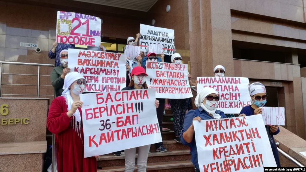 8-июнда Нур-Султан шаарында Эмгек жана социалдык коргоо министрлигинин алдында жыйырмага жакын көп балалуу эне «үнсүз» нааразылык акциясын өткөрүштү. Бул тууралуу Борбордук Азия жаңылыктары жазып чыкты.