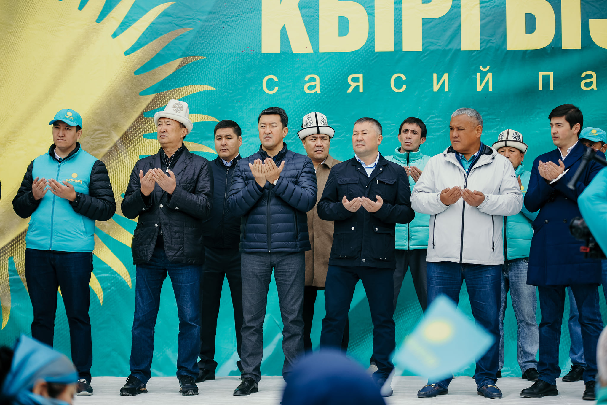 “Мен сиздерге ишенем. Шайлоо күнү бюллетенди алып добуш берүүчү бөлмөгө киргенде “Жүрөгүмдө Кыргызстан” деген биздин девизди туу тутуп, “Кыргызстан” партиясына добуш бересиздер деп ишенем. Өлкөнүн ар бир аймагында элине эмгеги сиңген, татыктуу талапкерлерибиз бар. Биз элибизге жардам берели деп Жогорку Кеңешке баратабыз. Калың элдин алдында баарыңыздарга сөз беребиз. Биз эч качан мамлекеттин бир тыйынына тийбей, элге гана жардам беребиз, буга чейин да берип келгенбиз”, – деди Алимбеков.
