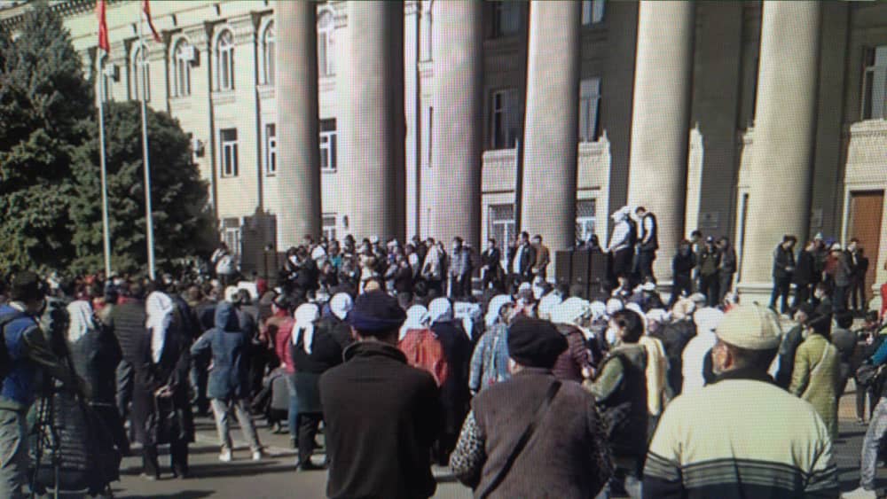 Чогулгандар Жогорку Кеңештин спикерлигине Канат Исаевдин шайланышын негизсиз деп эсептеп, президент Сооронбай Жээнбековдун кызматтан калуусун айтышууда. Учурда элдин саны барган сайын көбөйүп, митингдин жүрүшүндө «Аллоху акбар» деп кыйкырышты.