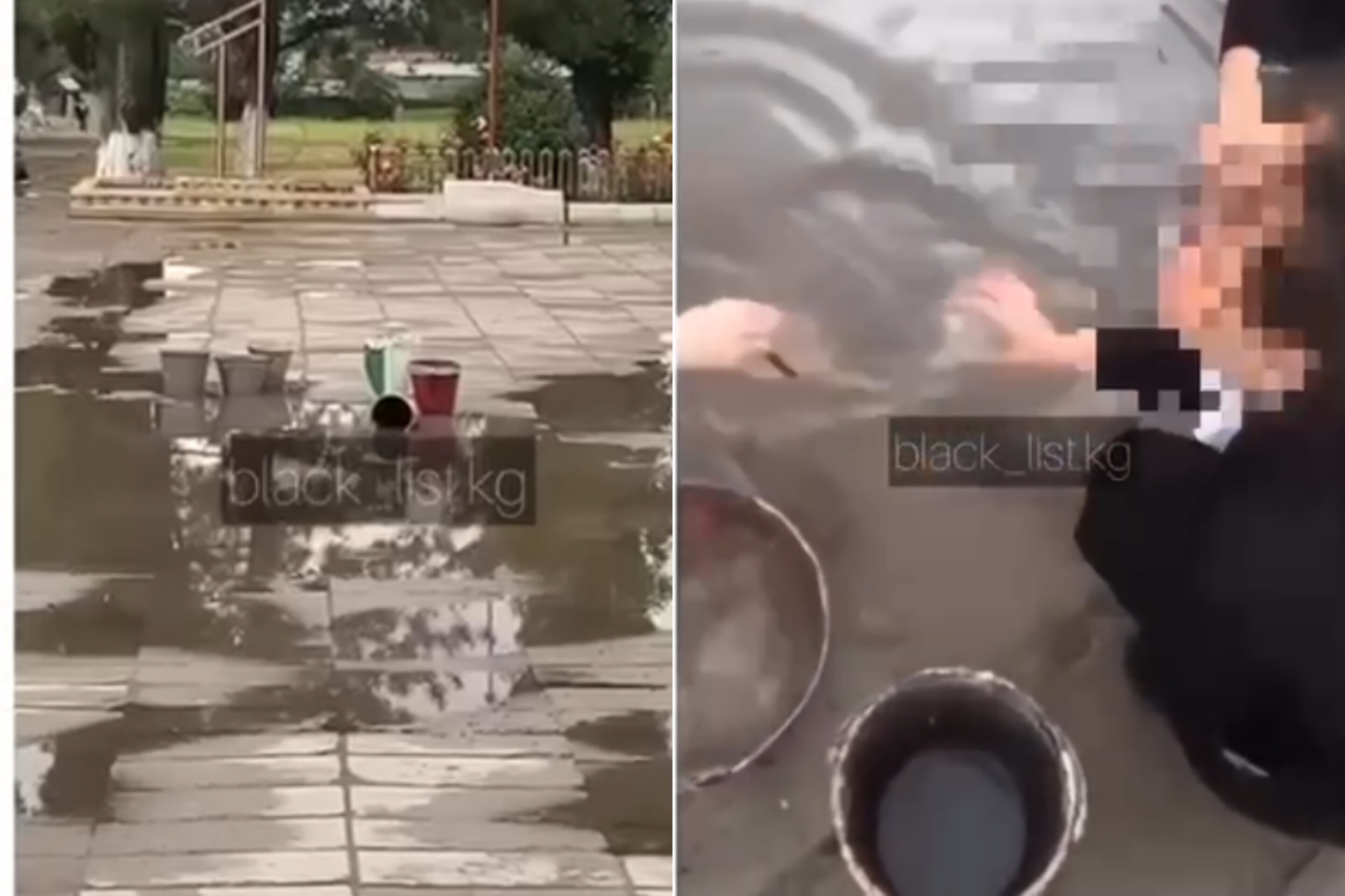 Социалдык тармактарда тараган видеодо окуучу кыздар көлчүктөгү сууну стакан менен тазалап жатканын көрүүгө болот.