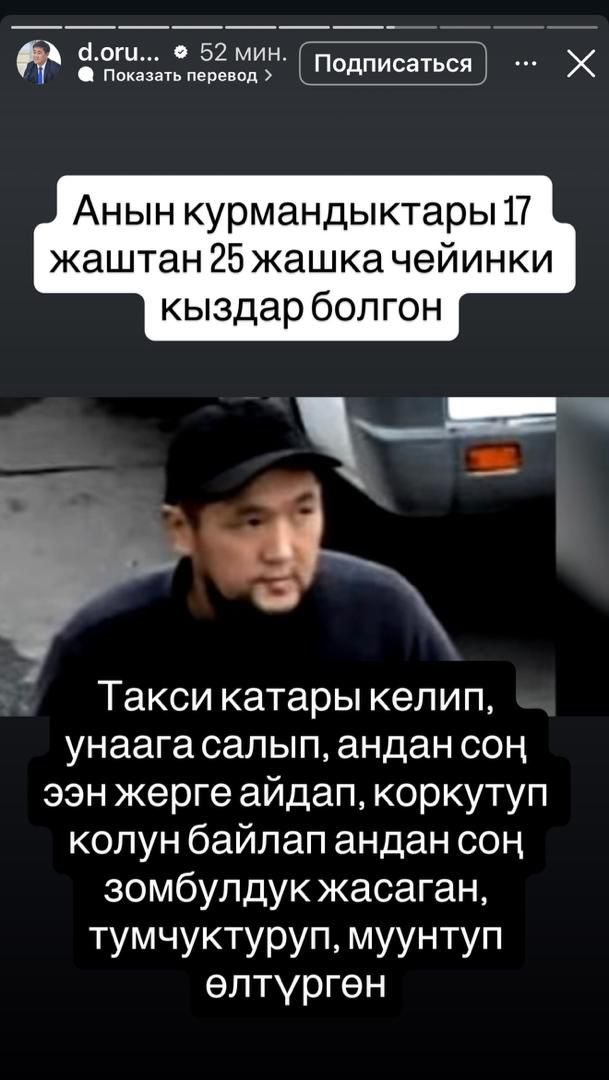 Маалыматка караганда, шектүү такси айдоочусу катары кыздарды унаасына салып, ээн жерге алып барып, колун байлап зомбулук көрсөткөн. Андан соң муунтуп, өлтүргөн учурлар катталган.