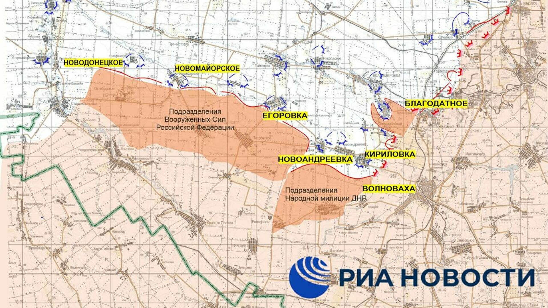 Картадан украин аскерлери мындан ары Волноваха конушун көзөмөлдөбөй турганын көрүүгө болот. Орусиянын куралдуу күчтөрү Новодонецкое - Новомайское - Егоровка конуштарынын линиясына жетти.