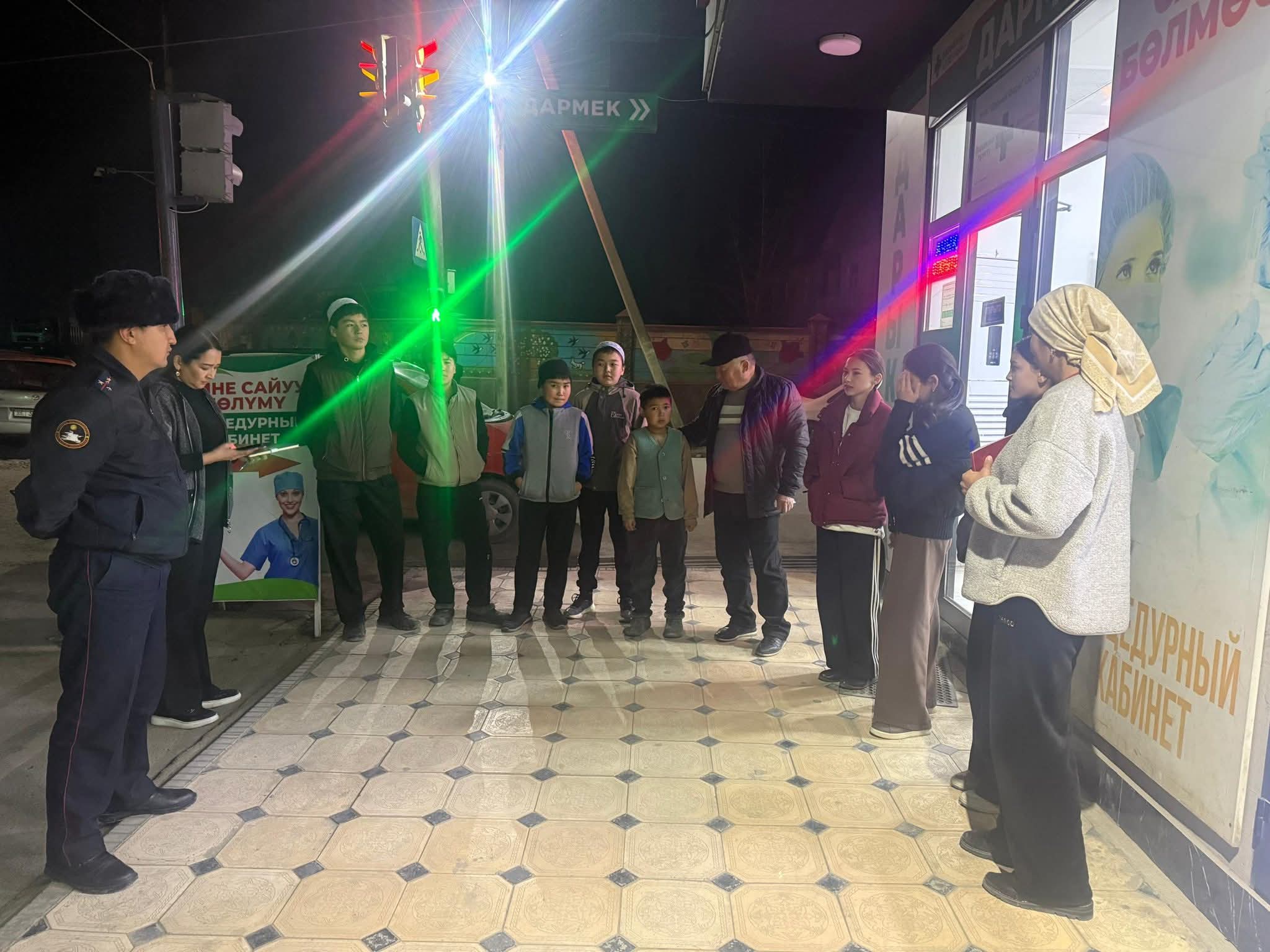 Анын алкагында түндө көчөдө жүргөн балдарга, ата-энелерине түшүндүрүү иштери жүргүзүлүп, эскертүүлөр берилүүдө.