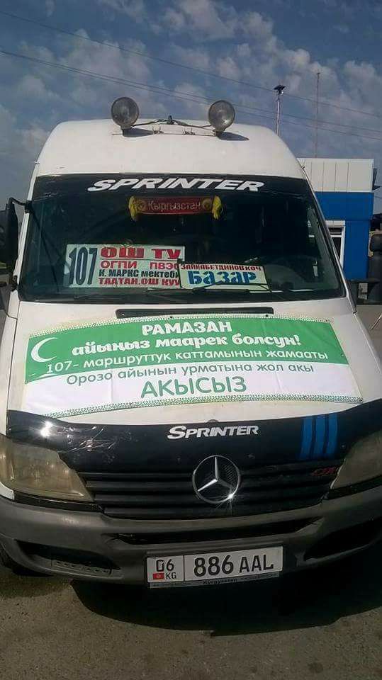 Ош шаарында 107-каттамдагы коомдук транспорттун айдоочулары орозо айында элге акысыз кызмат көрсөтөт. Бул тууралуу аталган каттамдын бригадири Матраим Асанов билдирди. Анын айтымында, эртеңден тарта күнүнө экиден маршрутка кезектешип жүргүнчүлөрдү бекер ташыйт.
