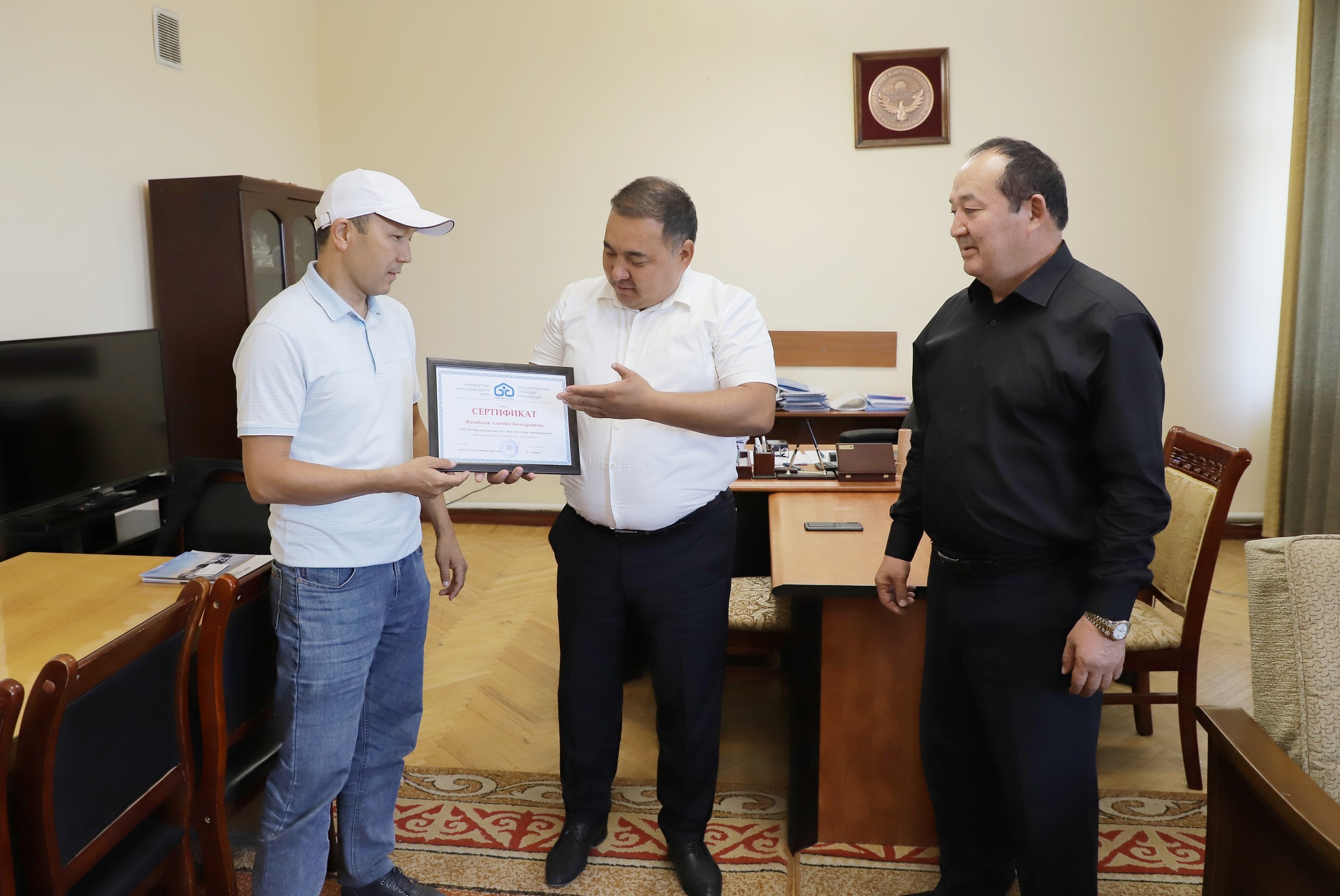 Сертификатты Ош шаарынын мэринин биринчи орун басары Марс Исаев жана Мамлекеттик камсыздандыруу уюмунун Оштогу бөлүмүнүн башчысы Төрөбек Нариев тапшырды.