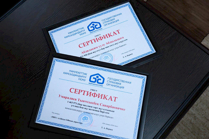 Маалыматка ылайык, президенттин өкүлүнүн орун басары Зарлык Турганбаев Мамлекеттик камсыздандыруу уюмунун (МКУ) Оштогу филиалынын директору Төрөбек Нариев менен биргеликте кырсыкка учурап, чоң чыгымга дуушар болгон Тынчтыбек Умаралиев жана Абдилаким уулу Абдыладыга каражаттардын сертификаттарын тапшырды.