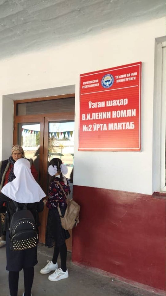 Социалдык тармактарда Өзгөн шаарындагы №2 Ленин атындагы орто мектебинин кире беришинде өзбекче тактай илинип турганын талкуулап жатышат.