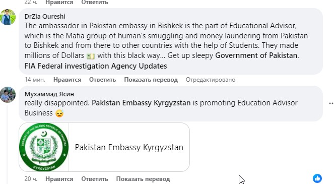Белгилей кетсек, элчиликтин Facebook тармагындагы баракчасында нааразачылыктар жана Пакистан өкмөтүнө кайрылуулар дагы жазылууда. Алар 18-май күнү Бишкектеги кырдаалды туруктуу деп баалагандыгы үчүн элчи Хасан Зайгамдын отставкасын талап кылышууда.