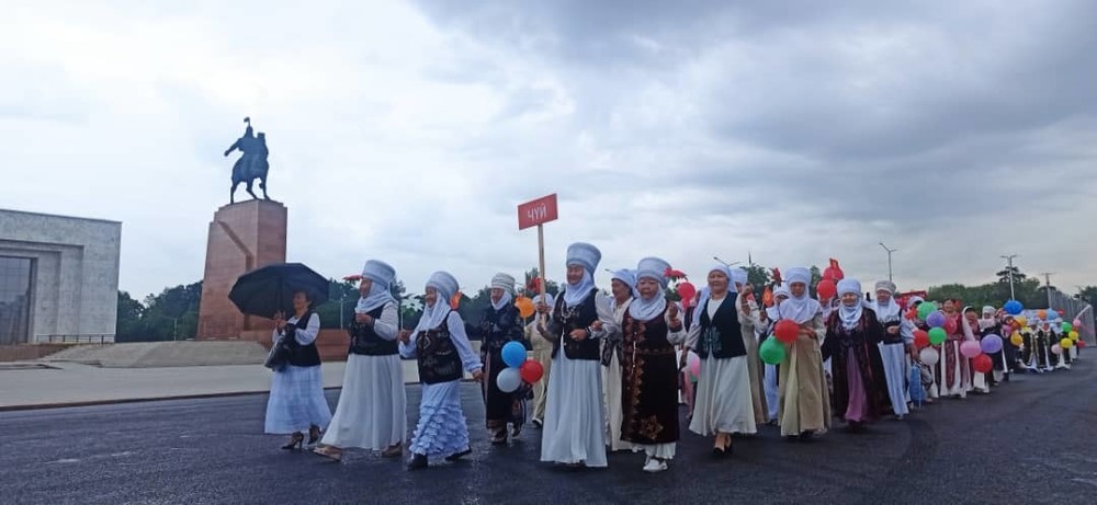 Катышуучулар борбордон Максим Горький атындагы скверге чейин басышты. Жолугушуунун алкагында аймактардагы активист айымдарга министр ардак грамоталарды тапшырган. Ошондой эле президент Садыр Жапаровдун атынан парадга катышкан 500 айымдын баарына ак жоолук беришти.