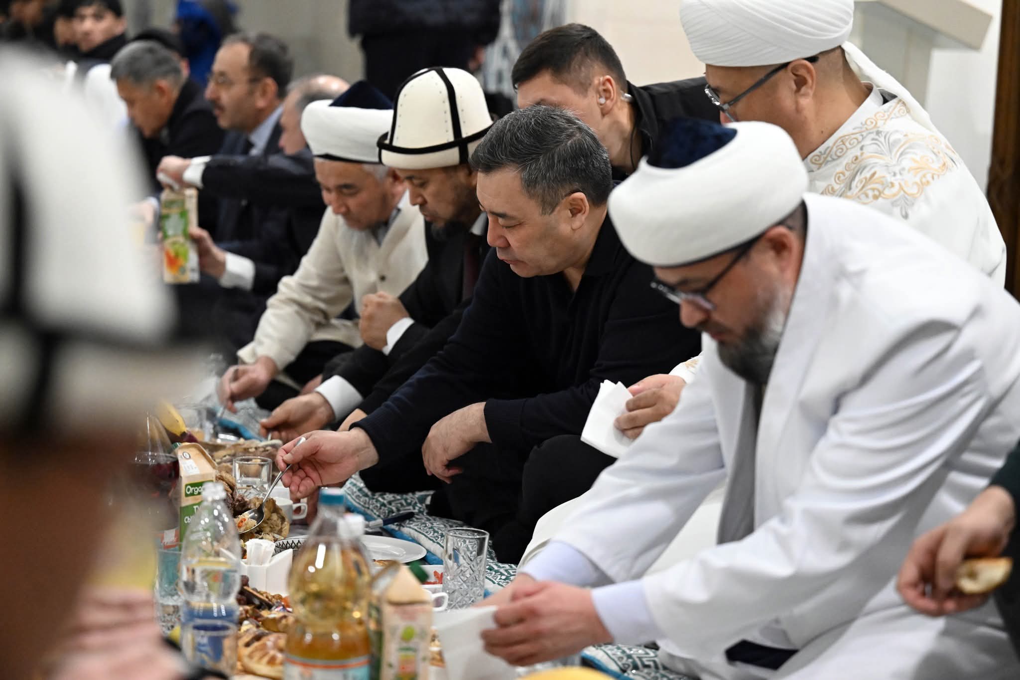 Кыргыз Республикасынын Президенти Садыр Жапаров бүгүн, 6-мартта, Бишкек шаарындагы Имам Сарахси атындагы республикалык борбордук мечитке келгендер үчүн ооз ачар өткөрдү.