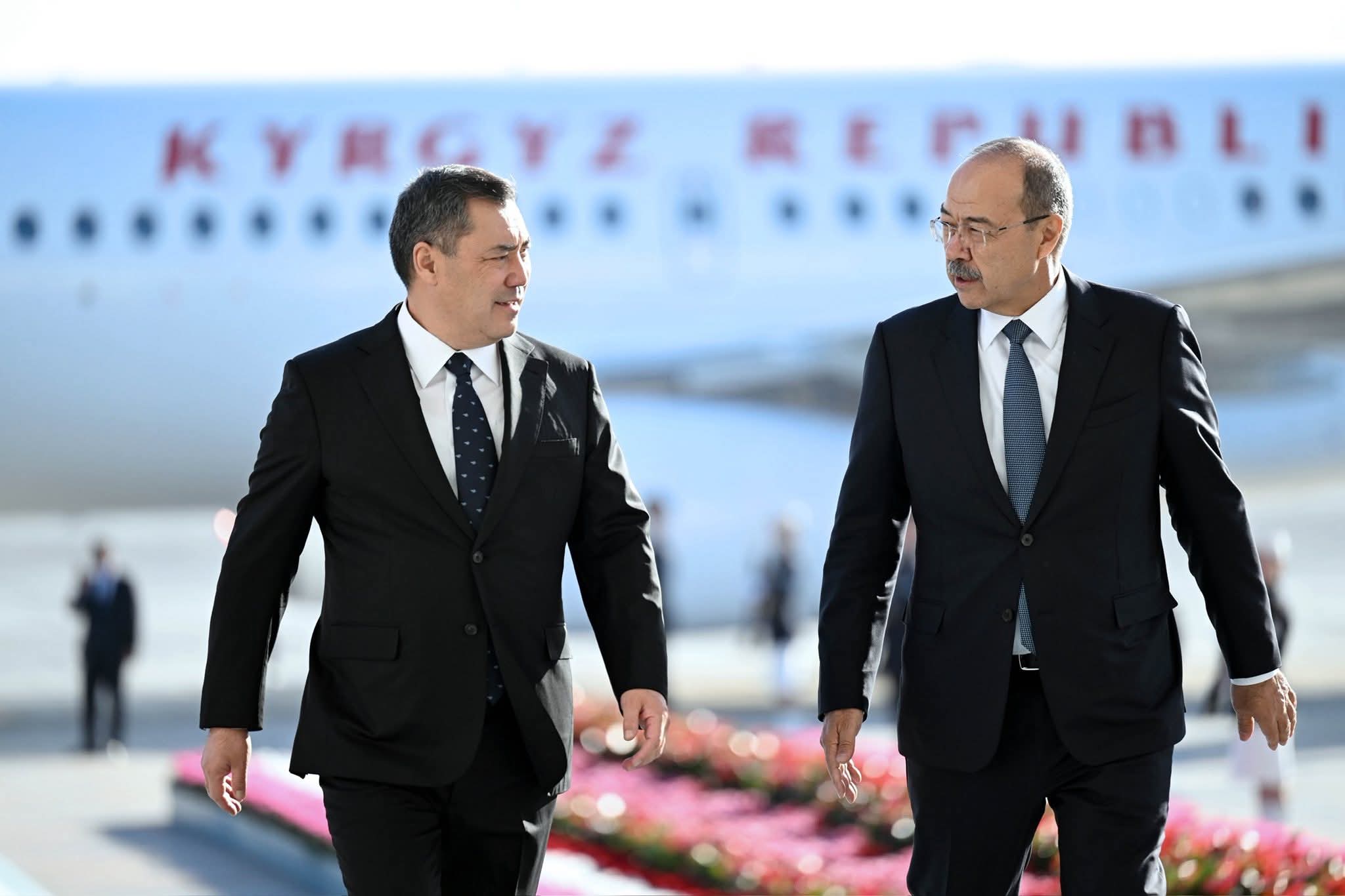 Президент Садыр Жапаровду Өзбекстандын Премьер-министри Абдулла Арипов жана башка расмий адамдар тосуп алышты.