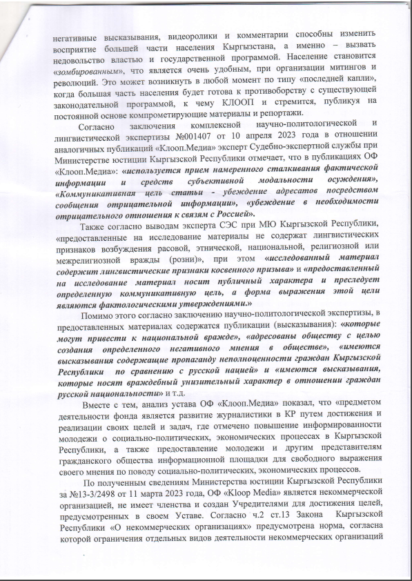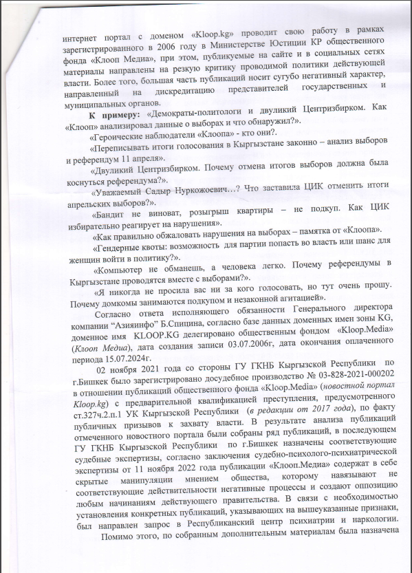 Маалыматка караганда, прокуратура доо арызында «Клооп Медиа» массалык маалымат каражаты катары каттоодон өтпөгөнүн, уставында ал нерсе көрсөтүлбөгөнүн билдирген.