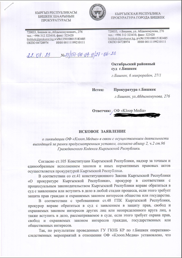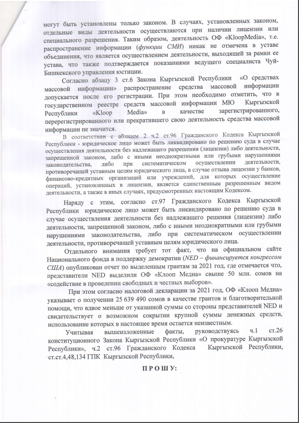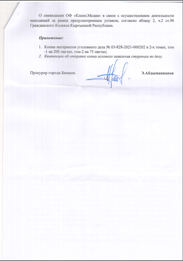 Бишкек шаардык прокуратурасы «Клооп Медиа» коомдук фондун жоюу боюнча Октябрь райондук сотуна доо арыз менен кайрылды. Бул тууралуу аталган басылма жазып чыкты.