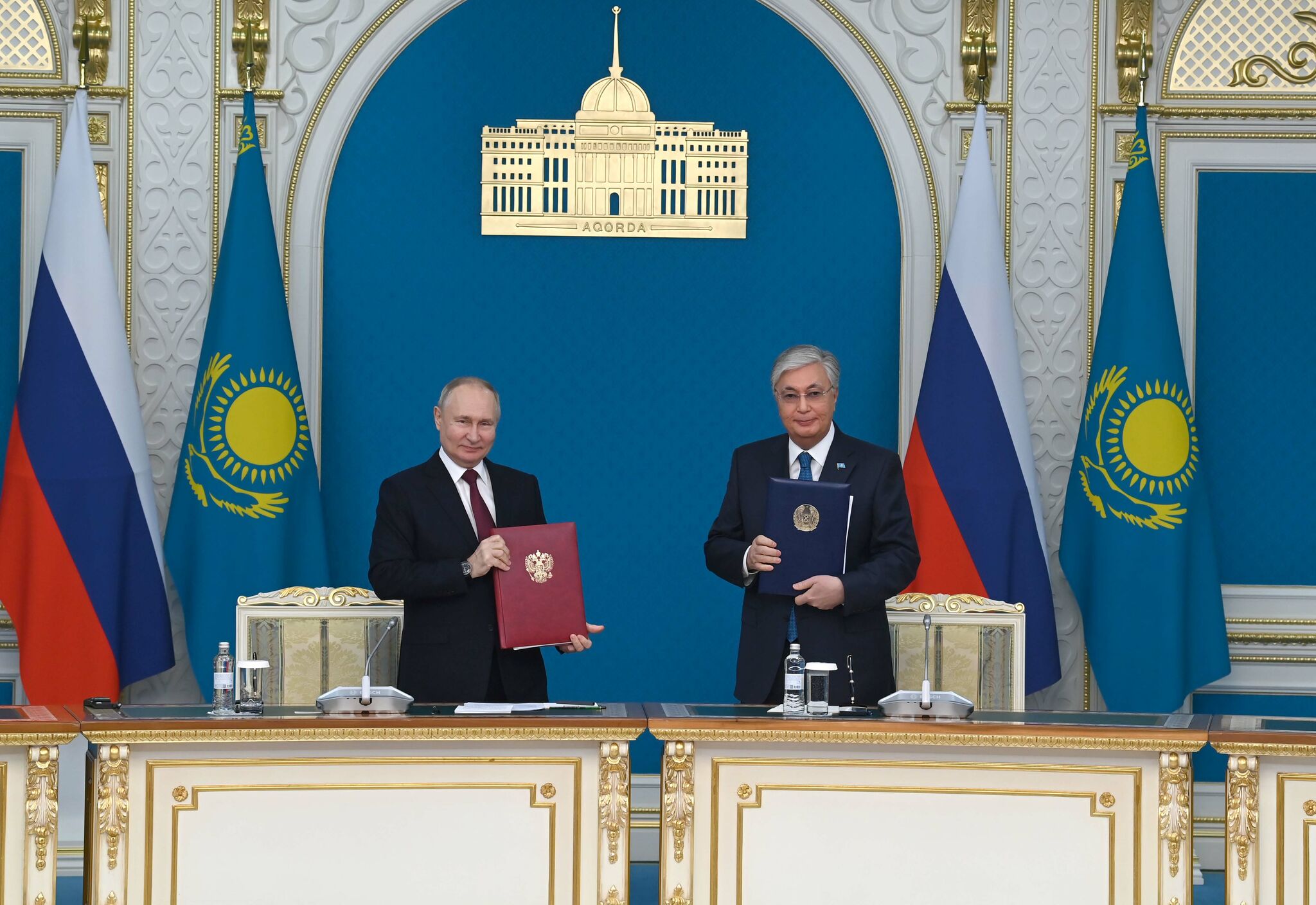 Казакстандын президенти Касим-Жомарт Токаев менен Орусиянын лидери Владимир Путин Астанадагы сүйлөшүүлөрдүн жыйынтыгы жана эки өлкөнүн 2024-2026-жылдарга биргелешкен иш-аракеттер планы боюнча биргелешкен билдирүүгө кол коюшту. Бул тууралуу Ак Ордонун басма сөз кызматы билдирди.