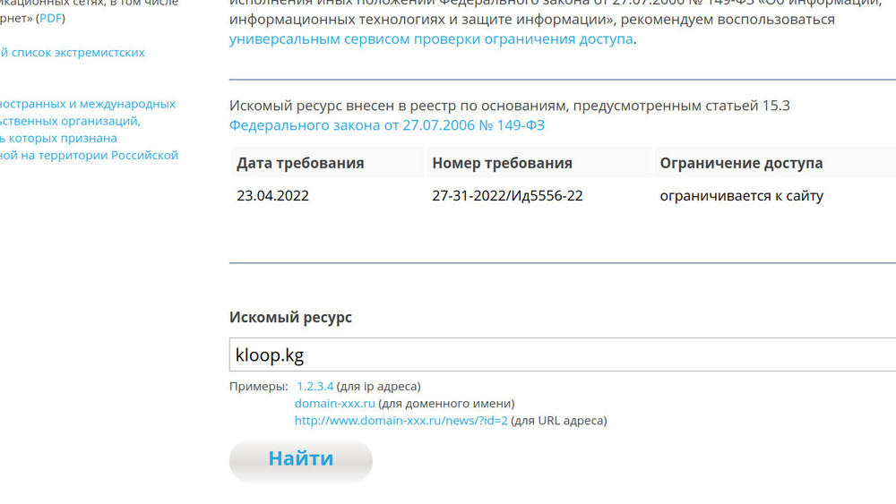 Орусиянын Байланыш жана маалымат технологияларын көзөмөлдөө боюнча федералдык кызматы (Роскомнадзор) Кыргызстандын «Kloop» сайтына Орусиядан кирүү мүмкүнчүлүгүн чектеди. Мекеменин сайтында айтылгандай, мындай чечим өлкөнүн Баш прокуратурасынын талабынын негизинде 23-апрелде кабыл алынган.