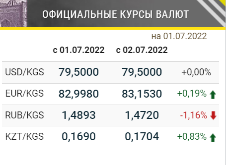 Кыргызстандын Улуттук банкы 2-июлга карата валюталардын сомго карата расмий курстарын жарыялады.