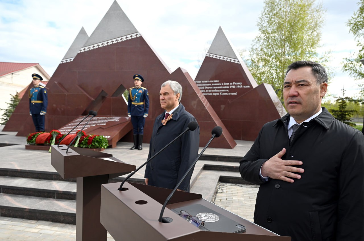 Президент Садыр Жапаров жана Россия Федерациясынын Мамлекеттик Думасынын Федералдык Жыйынынын төрагасы Вячеслав Володин мемориалга гүл коюп, курман болгон жоокерлердин элесин бир мүнөттүк унчукпай туруу менен эскеришти.