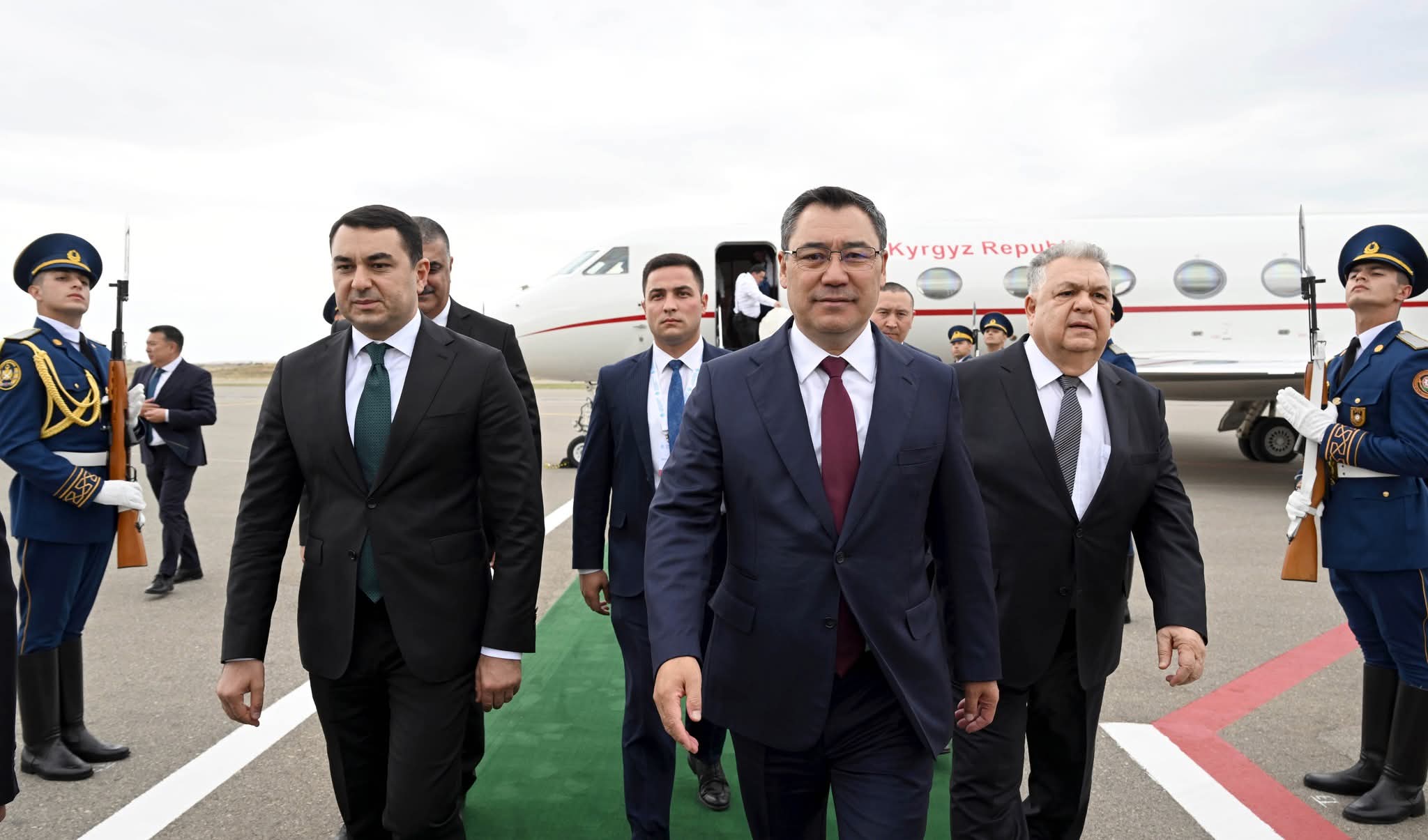 Мамлекет башчысынын учагы Физули шаарынын эл аралык аэропортуна конду. Садыр Жапаровду Азербайжан Республикасынын маданият министри Адиль Керимли жана башка расмий адамдар тосуп алышты.