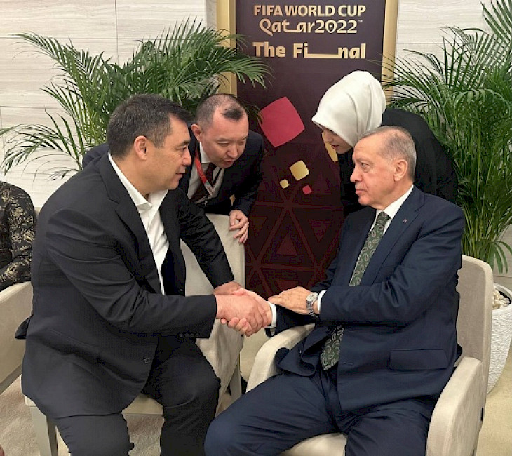 Президент Садыр Жапаров 18-декабрда футбол боюнча Дүйнө чемпионаты — 2022 алкагында Доха шаарында (Катар Мамлекети) Түркия Республикасынын президенти Режеп Тайип Эрдоган менен жолугушту.