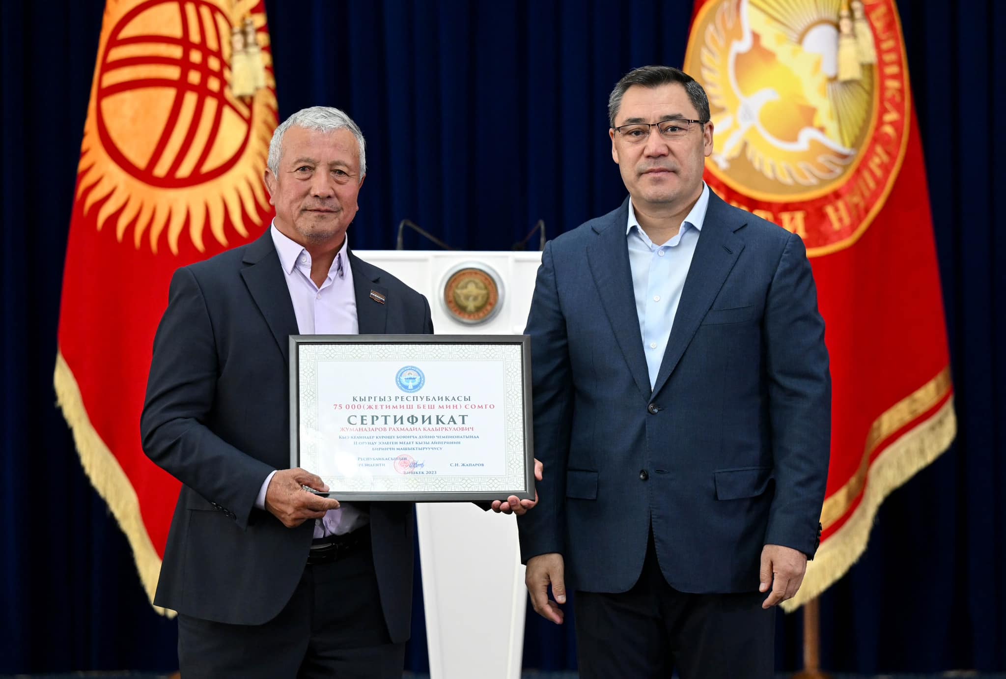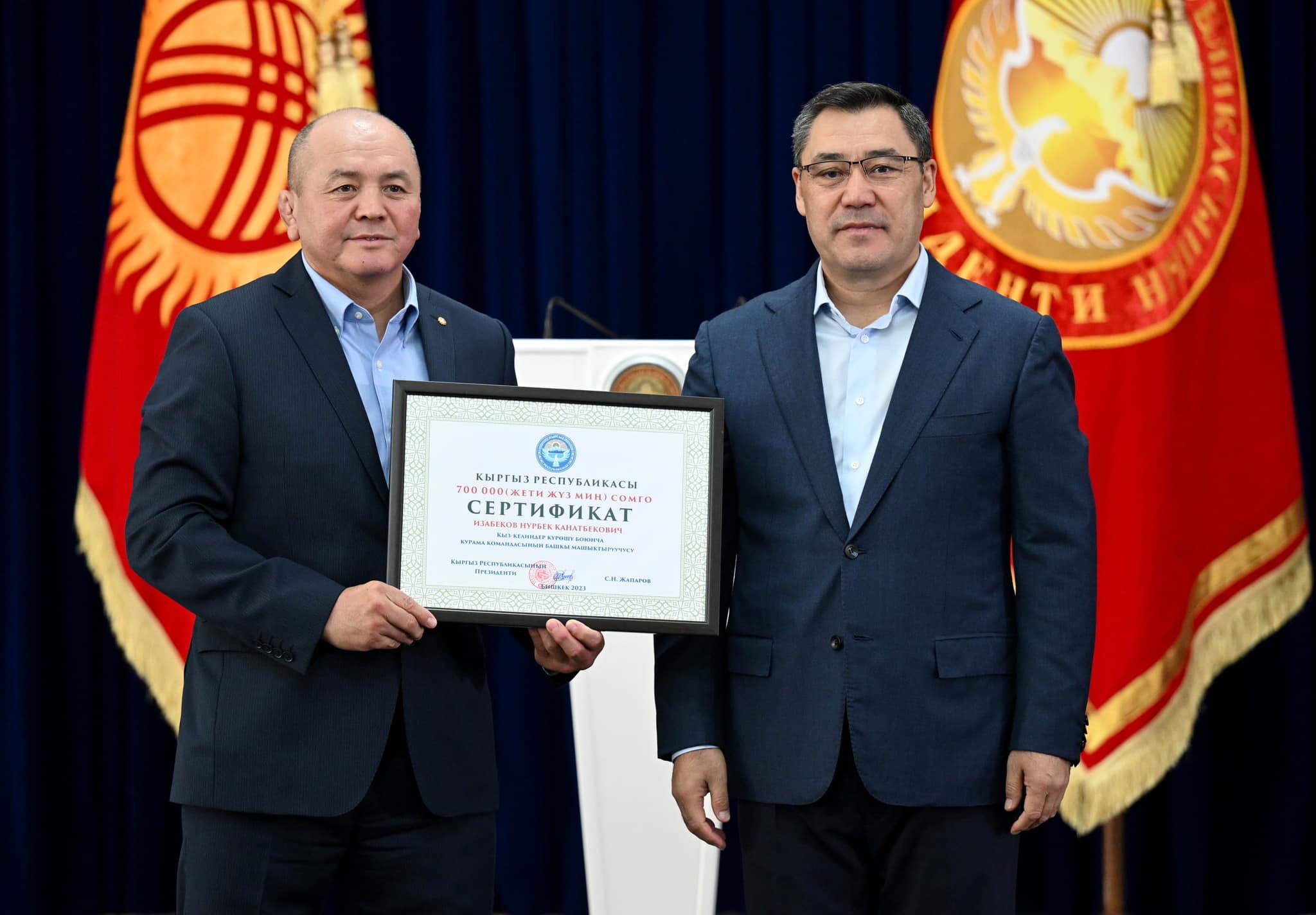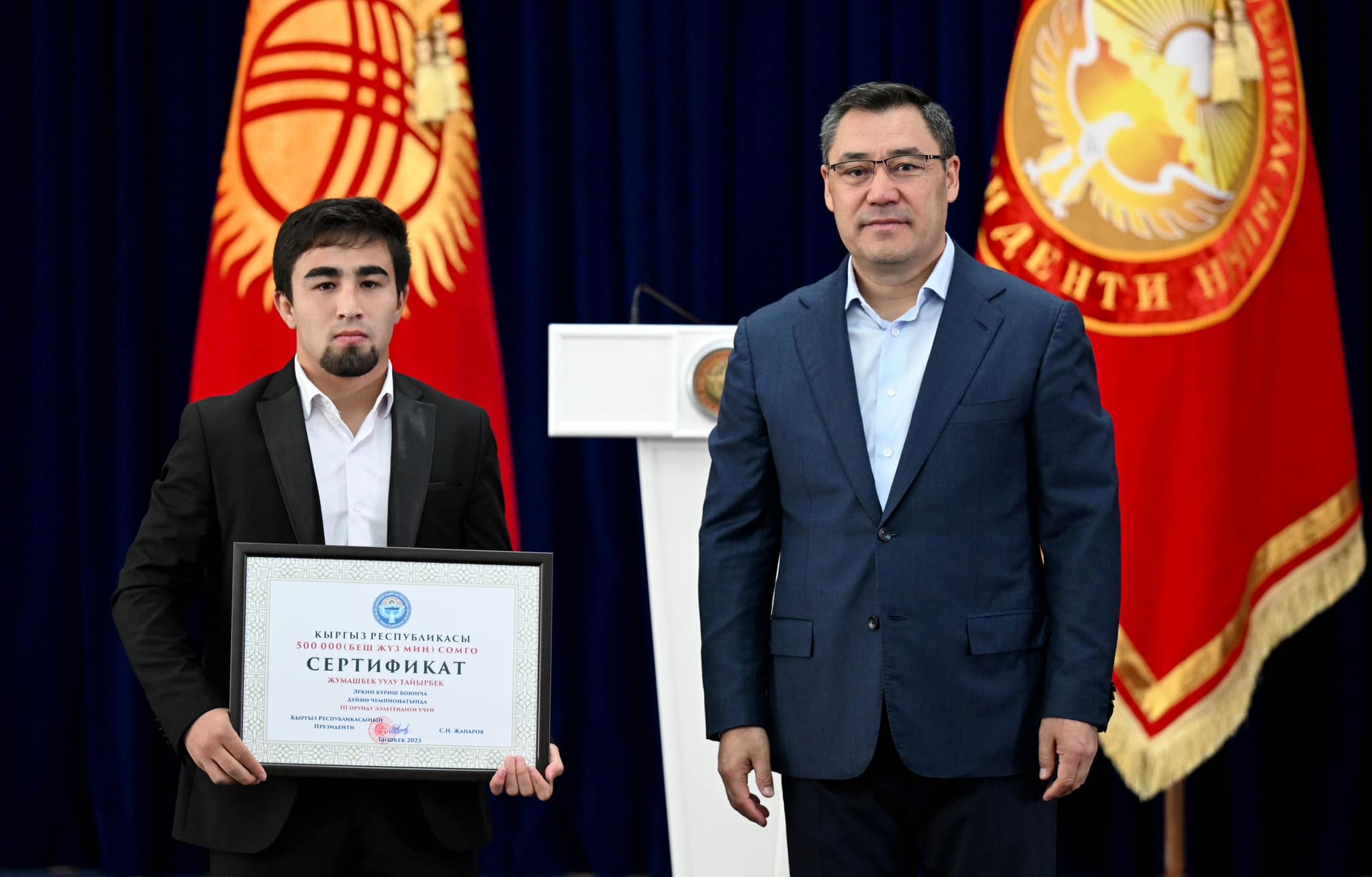 Сыйлоо аземинде Мамлекет башчысы жеңүүчүлөргө төмөндөгүдөй өлчөмдөгү акчалай сертификаттарды тапшырды:
