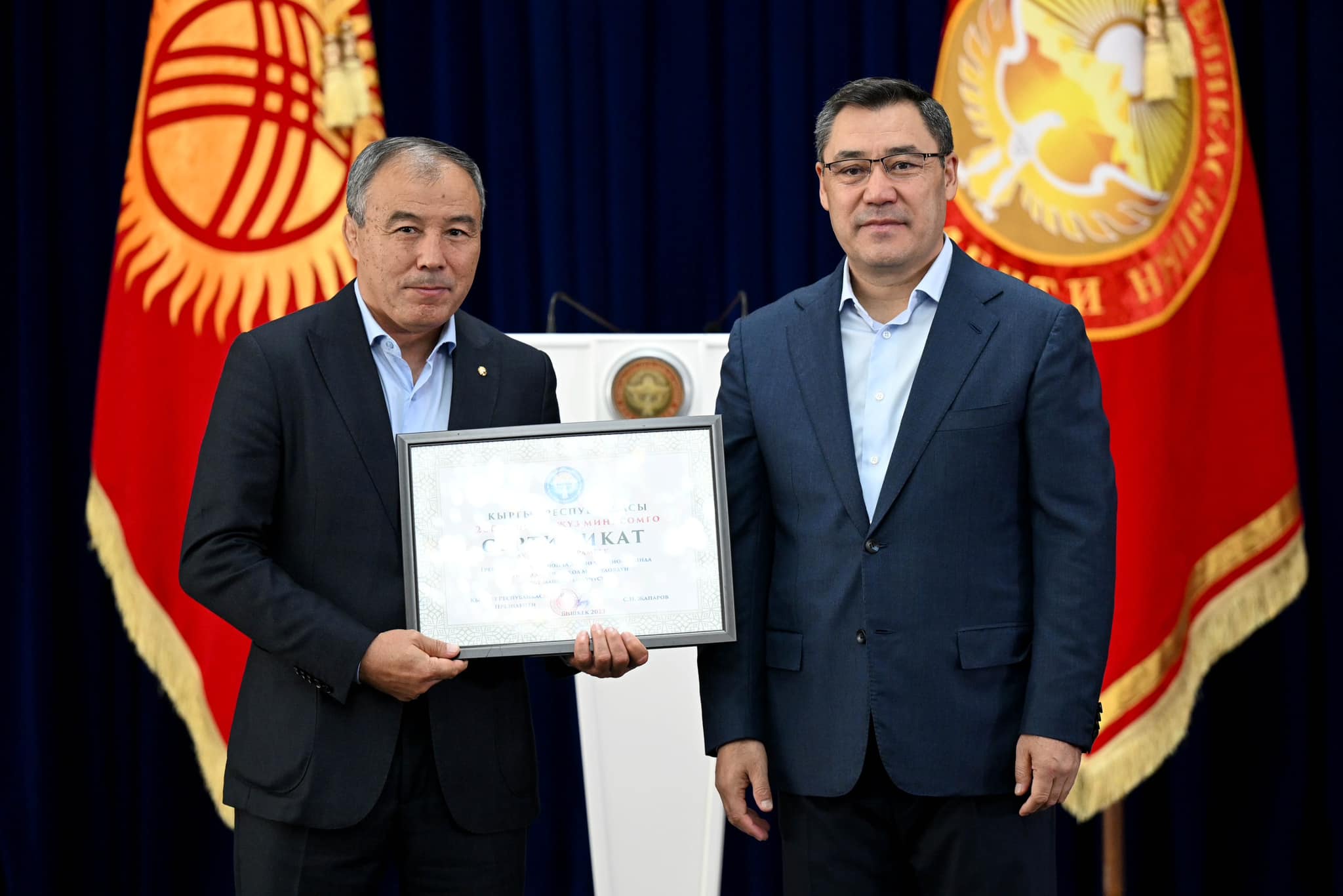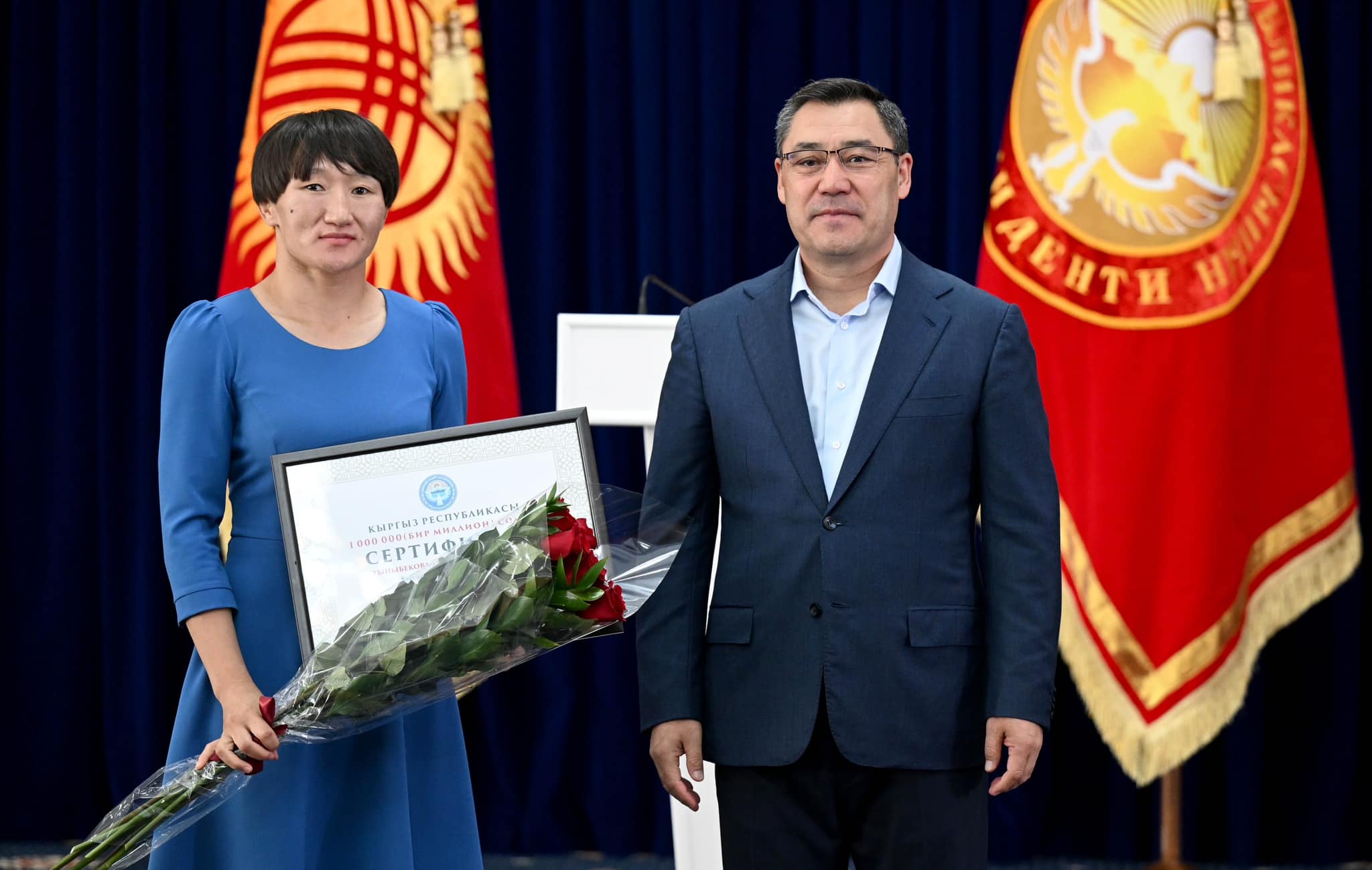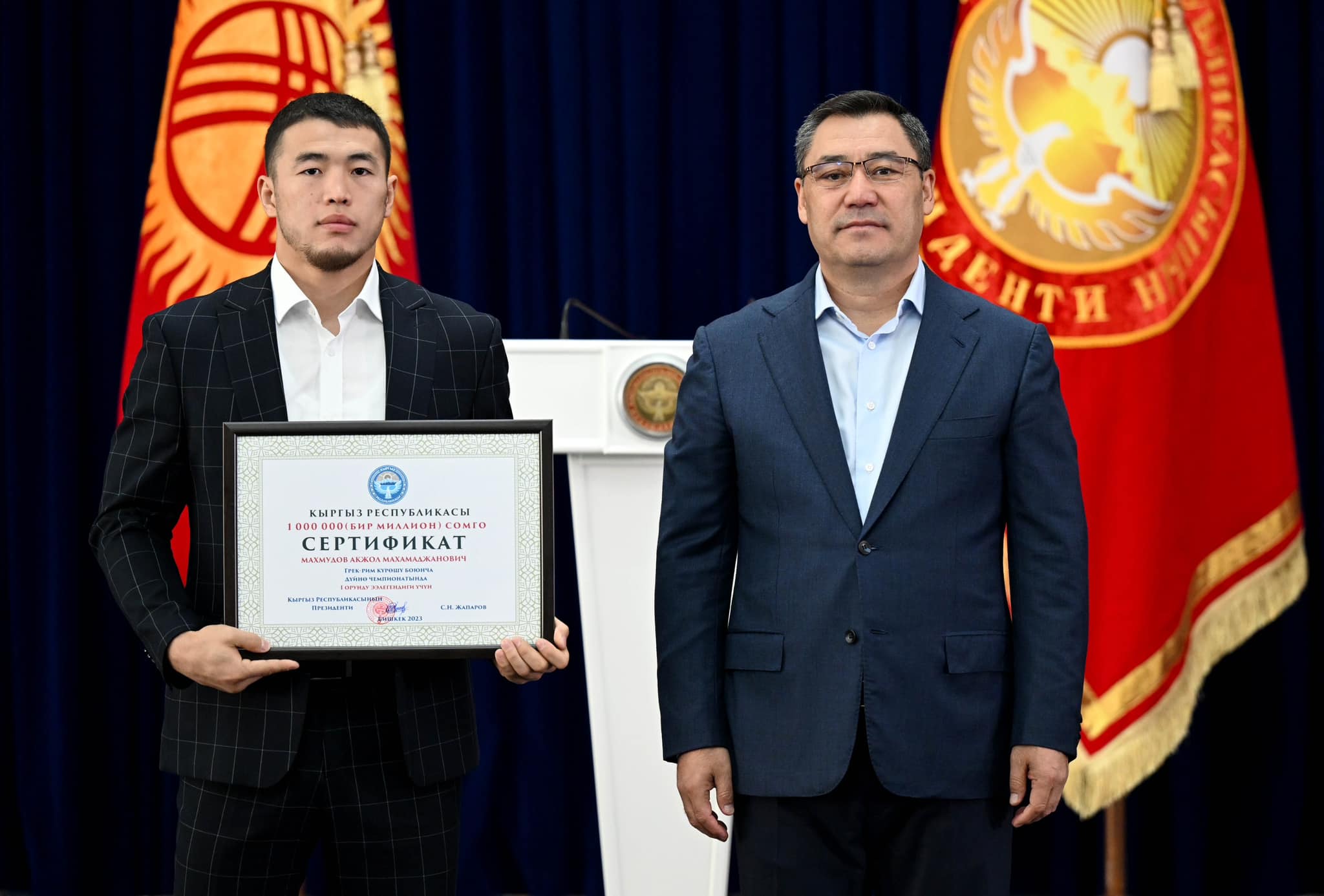 Сыйлоо аземинде Мамлекет башчысы жеңүүчүлөргө төмөндөгүдөй өлчөмдөгү акчалай сертификаттарды тапшырды: