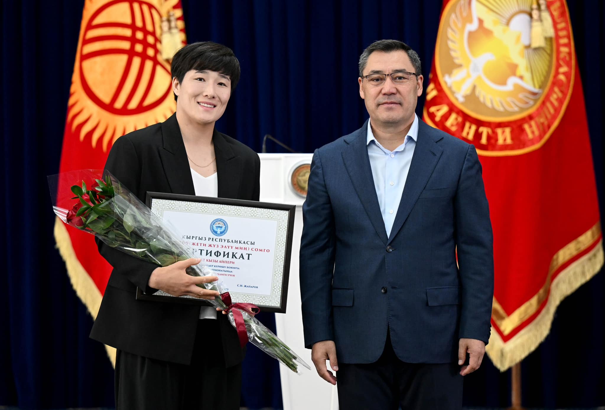 Президент Садыр Жапаров спортчуларга жана команданын машыктыруучуларына чың ден соолук каалап, мындан ары да өсүп келе жаткан муунга жакшы үлгү көрсөтүп, бүткүл дүйнөнү таң калтыра турган кыргыз спортчуларын тарбиялоону суранды.