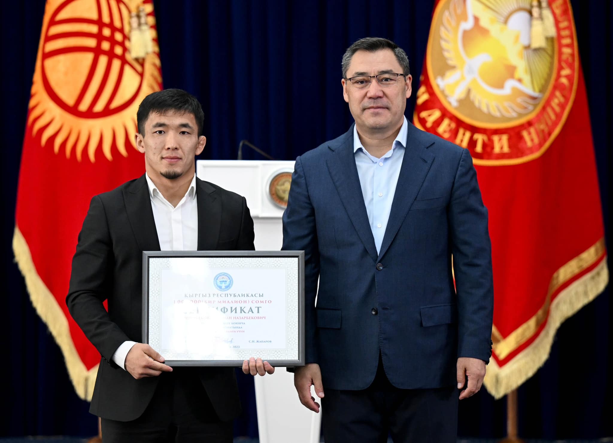 Мамлекет башчысы өлкөнүн улуттук курама командасынын жалпы машыктыруучуларына талыкпас эмгекчилдиги, өзгөчө мекенчилдиги менен эл аралык деңгээлде даярдаган спортчулары өлкөгө жеңиш алып келгени үчүн ыраазычылык билдирди. Мындан тышкары, Садыр Жапаров чемпиондорду тарбиялоого кошкон салымын белгилөө менен алардын ата-энелерине да ыраазычылык билдирди.