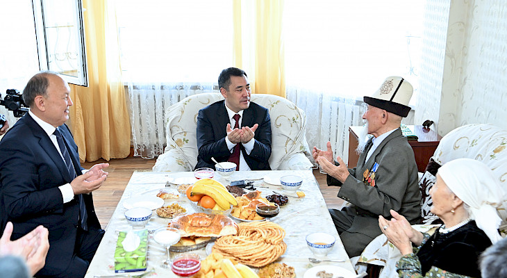 Кыргызстандын президенти Садыр Жапаров бүгүн, 9-майда Улуу Ата Мекендик согуштун ардагери Аспек Жумашевдин үйүнө барып, андан кабар алды.