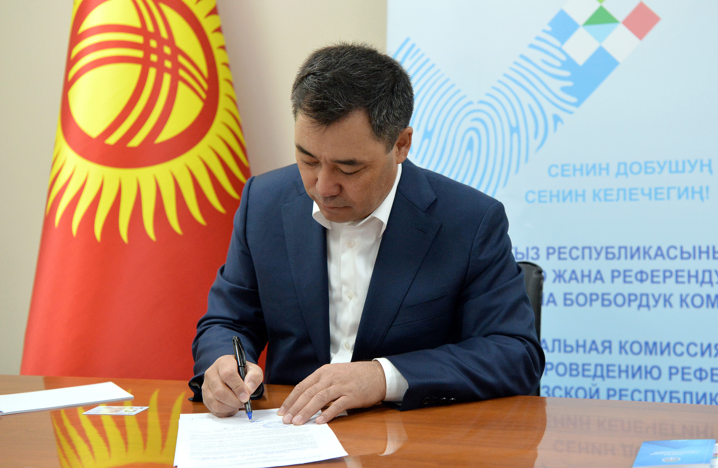 Кыргыз Республикасынын Президентинин кызмат ордуна талапкерлердин документтеринин тизмеси жөнүндө КР БШКсынын токтомуна ылайык, Садыр Жапаров Кыргыз Республикасынын Президентинин кызмат ордуна талапкерлигин көрсөтүү ниети жөнүндө арызын, башка мамлекеттин жарандыгы жок деген маалыматты, чет мамлекеттин жарандыгы жоктугу боюнча жеке маалыматтарды карап чыгууга жазуу түрүндө макулдугун, мамлекеттик тилди билүү деңгээли тууралуу сертификатты жана башка зарыл маалымкаттарды, документтердин формаларын жана көчүрмөлөрүн тапшырды.
