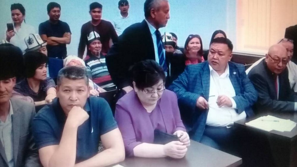 Садыр жапаровдун сотуна, Нооманжан Аракабаев, Бөдөш Мамырова, Эмилбек Каптагаев, Камила Талиева, ЖК депутаты Зиядин Жамалдинов жана Садыр Жапаровдун тарапташтары сот залында олтурушат.