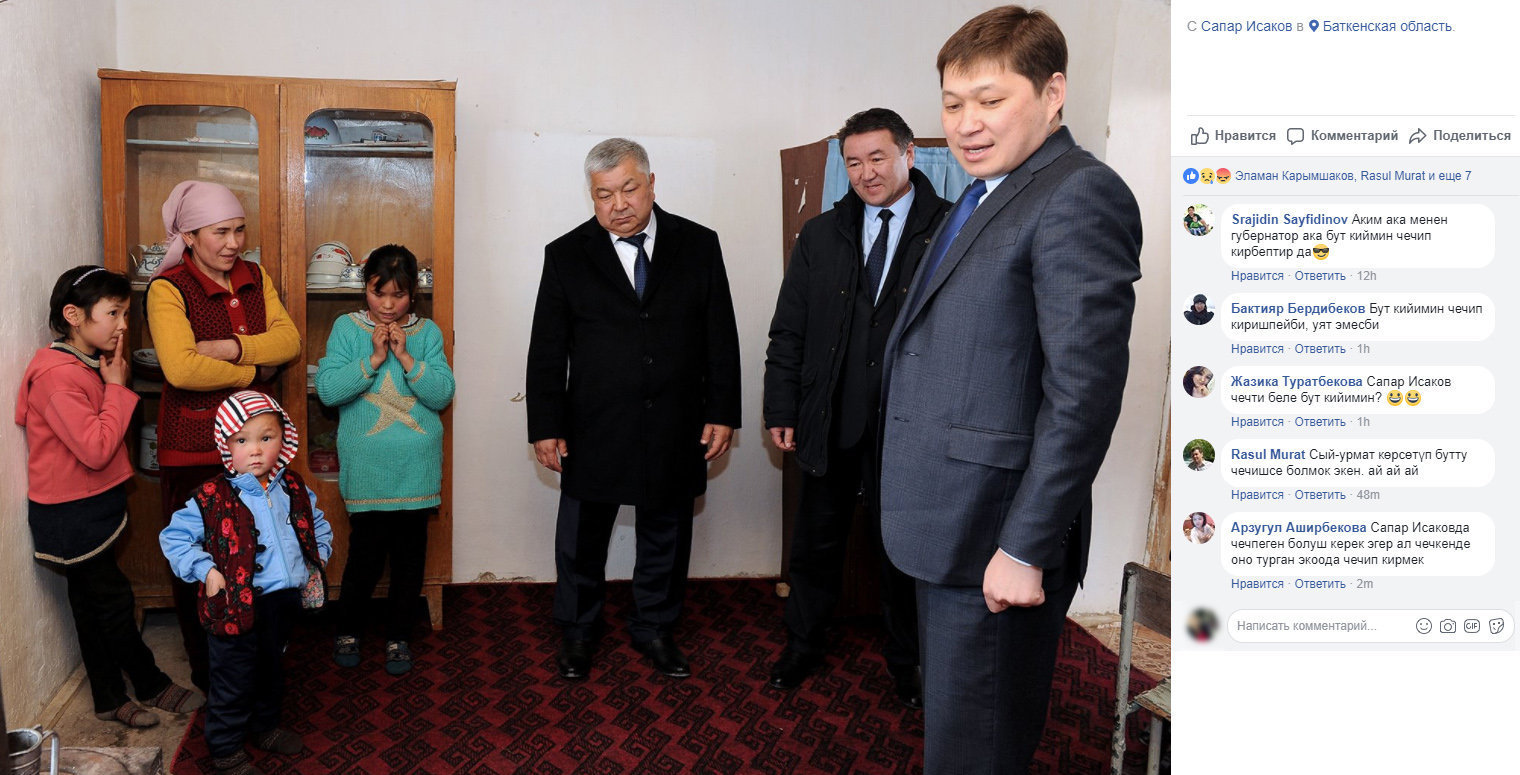 Өкмөт башчы аймактарга болгон иш-сапарларынын жүрүшүндө аз камсыз болгон үй-бөлөлөрдүн абалынан кабар алып келет. Буга чейин Ысык-Көл облусуна болгон иш-сапарында да жакыр жашагандар менен үйүнө барып жолуккан.